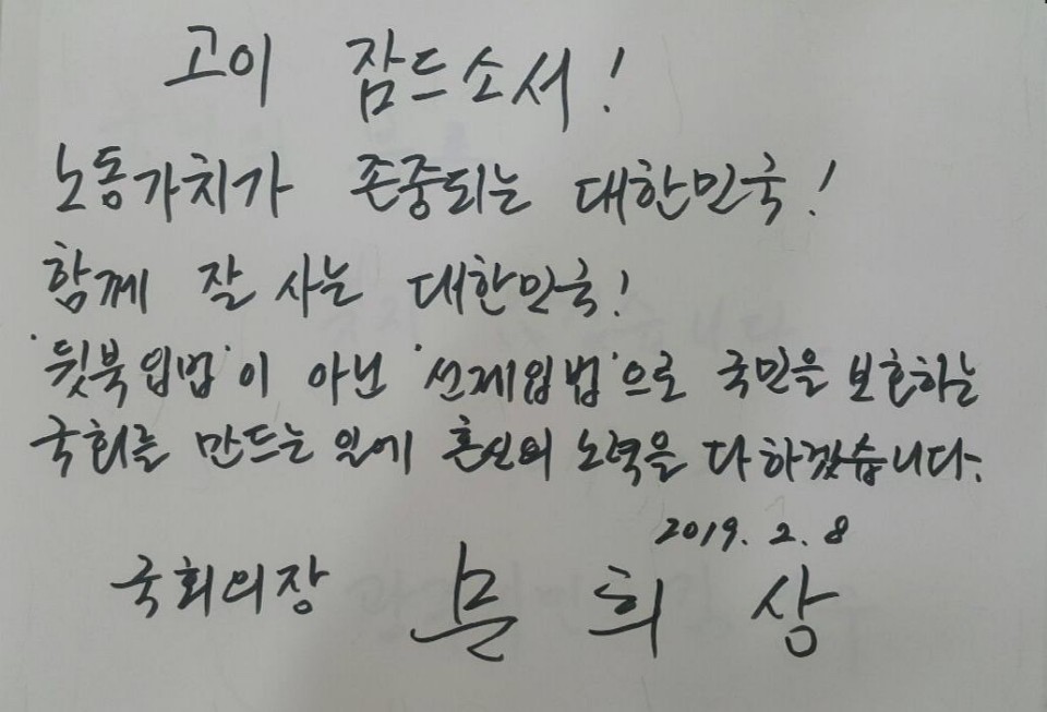 문 의장은 이날 박수현 비서실장을 서울대병원 장례식장에 차려진 고(故) 김용균씨 빈소에 보내 “국민을 보호하는 국회를 만드는 일에 혼신의 노력을 다하겠습니다”라는 애도의 뜻을 전했다.