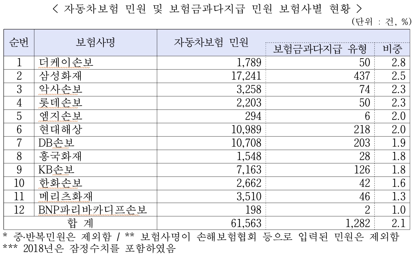 그러나 전체 자동차보험 민원 중 보험금과다지급 민원이 차지하는 비중이 높은 손해보험사는 ①더케이손해보험으로 2.8%나 되었으며, 다음으로 ②삼성화재 2.5%, ③악사손해보험․롯데손해보험이 각 2.3%, ④엠지손해보험․현대해상이 각 2.0%. ⑤DB손해보험 1.9% 등의 순이었다.