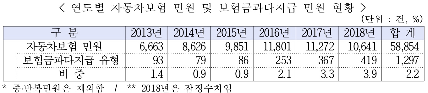 김정훈 의원실(부산 남구갑)에서 금융감독원에 자료요청을 통해 받은 답변자료를 살펴보면, 지난 2013년~2018년까지 6년간 자동차 보험금과다지급으로 접수된 민원은 총 1,297건인 것으로 조사되었다.
