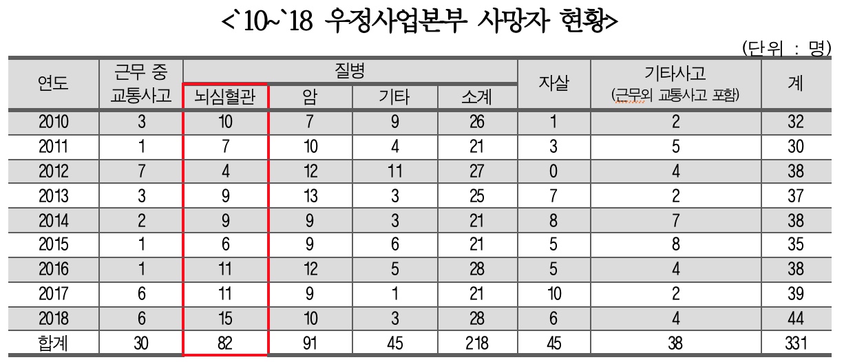 - 2010년 이후 우본 직원 사망자 331명 달해, 과로사만 82명(24.8%) -