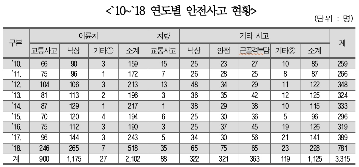 이륜차사고, 차량사고, 낙상사고, 안전사고 등 모든 영역에서 안전사고가 늘어났다.