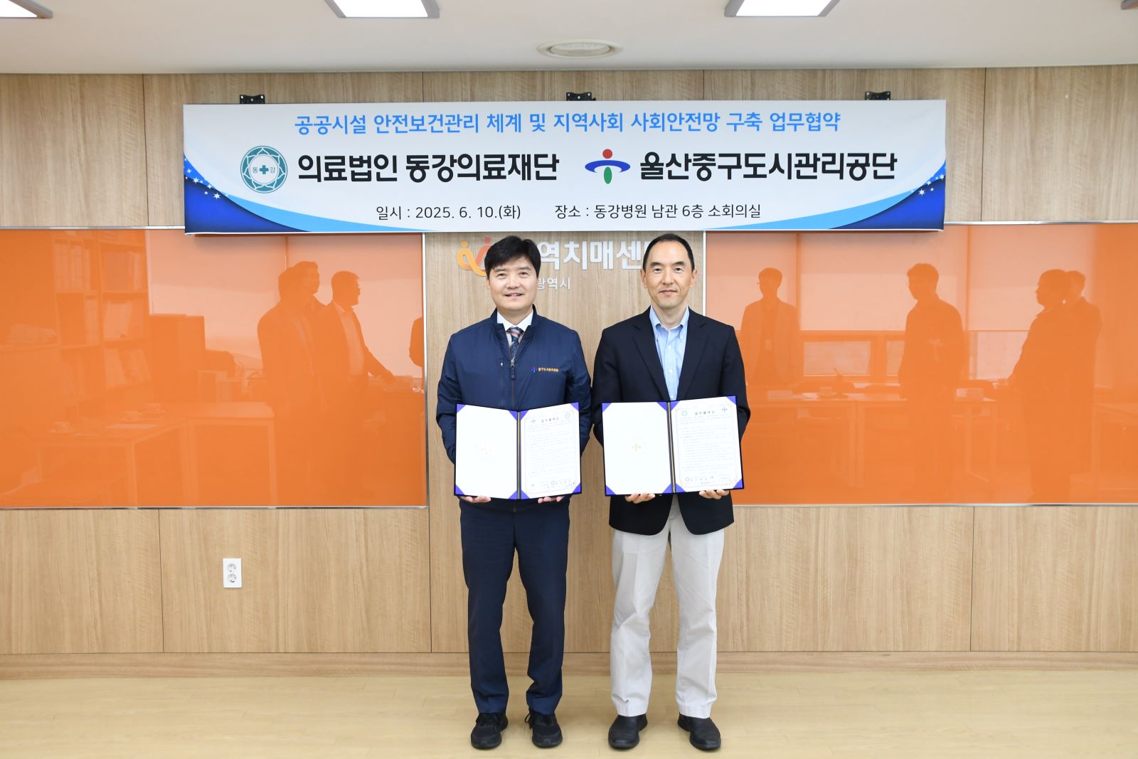 울산중구도시관리공단(이사장 김종윤)과 동강의료재단 동강병원(이사장 박원희)이 6월 10일 오전 11시 동강병원 남관 소회의실에서 ‘공공시설 의료 안전망 구축’ 업무협약을 맺었다.